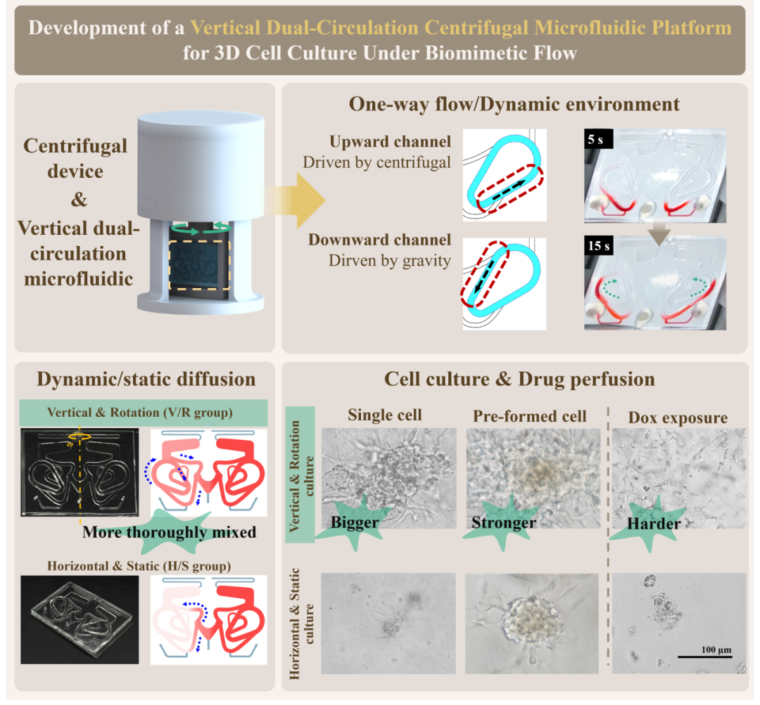 研究团队成功开发出一种集成定制离心装置的垂直双循环离心微流控平台,通过巧妙地结合离心力和重力,实现了稳定、长期的双向流体循环和可调的浓度梯度,解决了传统静态培养和部分动态平台的技术瓶颈。该技术能够支持类器官更快速、更接近体内状态的生长和形态发生,为构建更先进的体外疾病模型提供了强大工具。